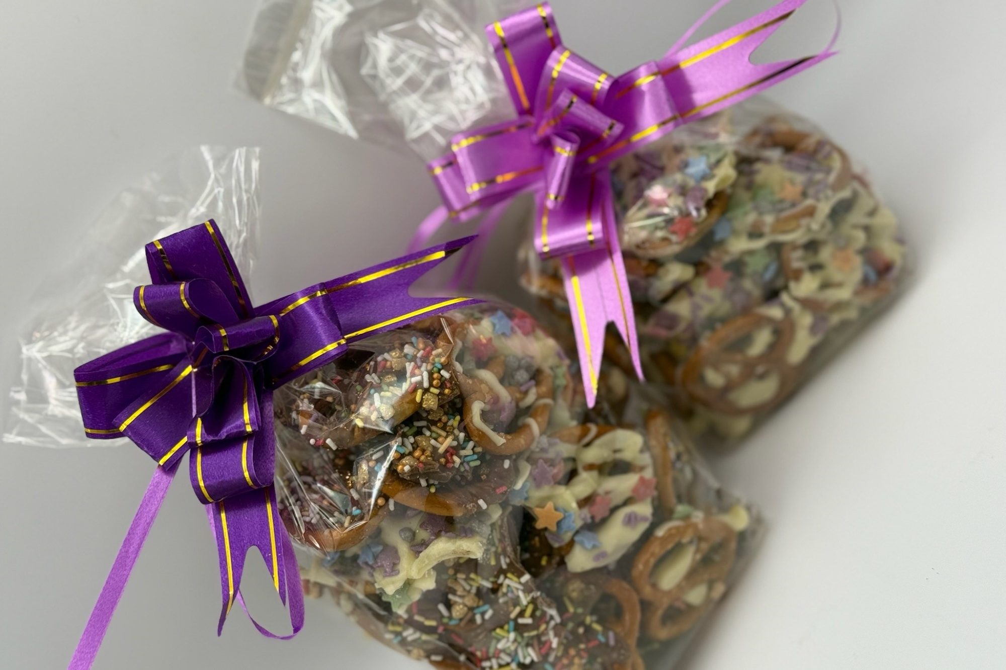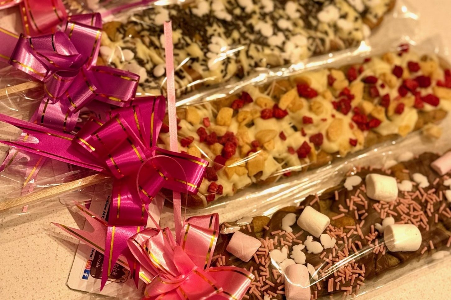 Our amazing Chocolate Drizzle Treats include Marshmallow or Cookie sticks and bags of pretzels. All customised with your choice of Milk, White, Dark (Vegan) or White Vegan chocolate, and toppings!